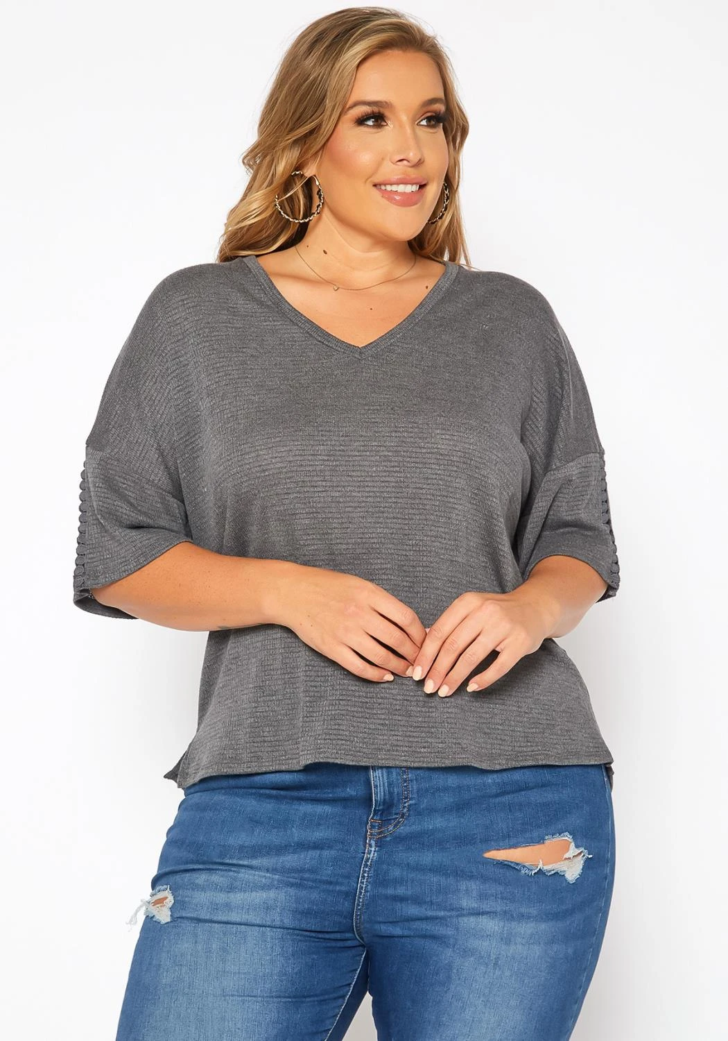 Plus size women’s comfy knit t-shirt in v-neck style and boxy short sleeves with crochet hem.