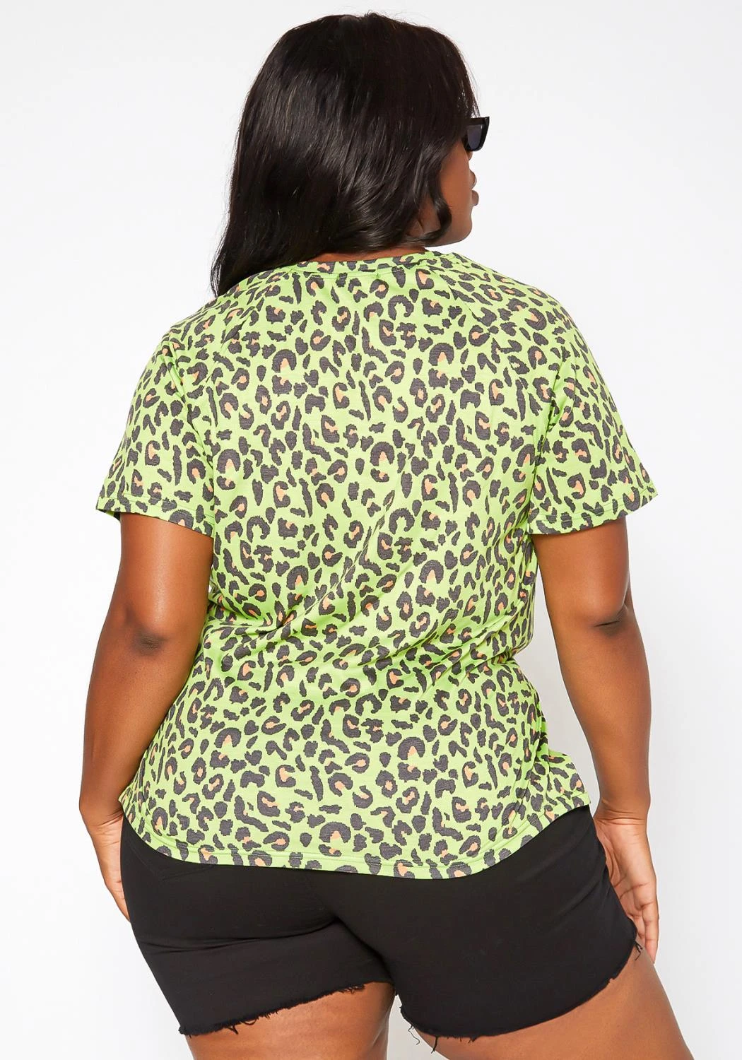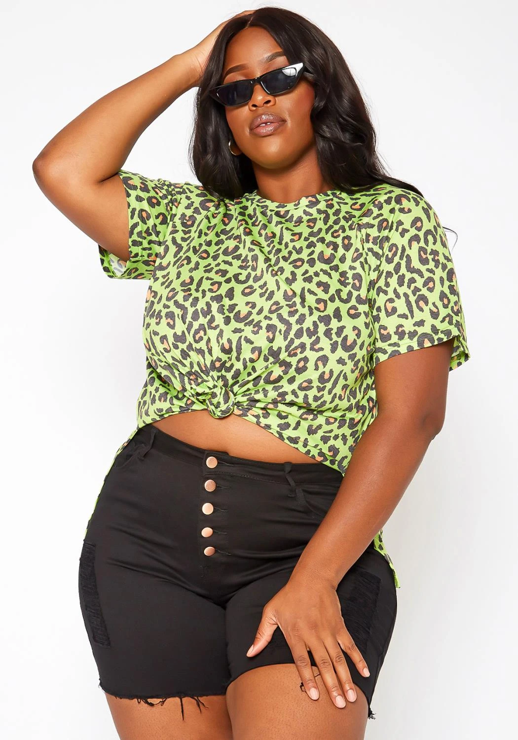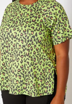 Plus size women’s t-shirt in leopard print, crew neck style, short sleeves and slit hem details.