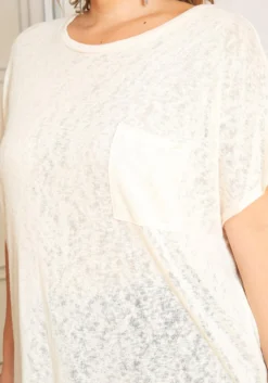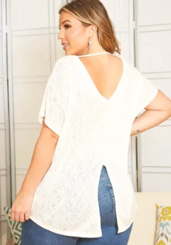 Plus size women’s casual t-shirt in light knit material, round neck style, short sleeve, hip length, open back design and centered back slit hem detail.