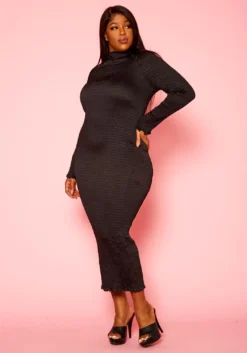 Plus size women’s neon orange faux wrap dress with balloon sleeves.