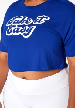Plus size women’s ‘Take it Easy’ statement crop top in crew neck style, short sleeves and relaxed fitting.