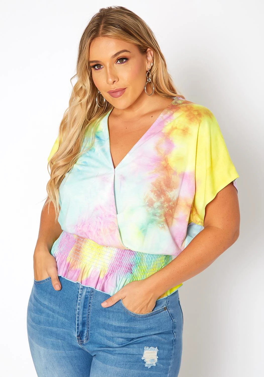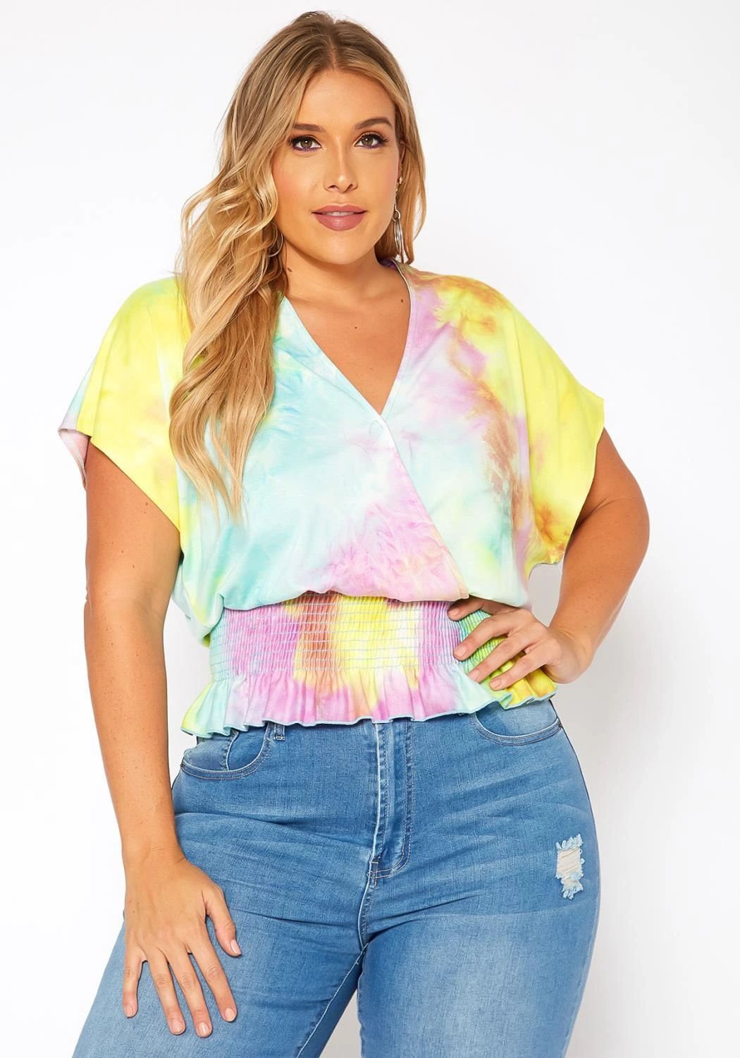 Summer tie dye plus size women’s top in v-neck style short dolman sleeves and smocked hem for stretch support.