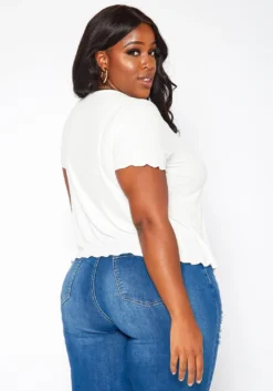 Trendy fashion top for plus size women with double tie-front ascent, lettuce trim, short sleeves, ribbed material and v-neck style.