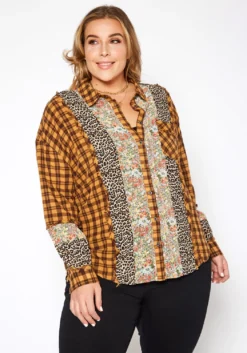 All the vintage prints in one! Features tartan plaid, leopard print, tiny floral print, full front button closure, collar neck and long sleeves with buttoned wrist cuffs.