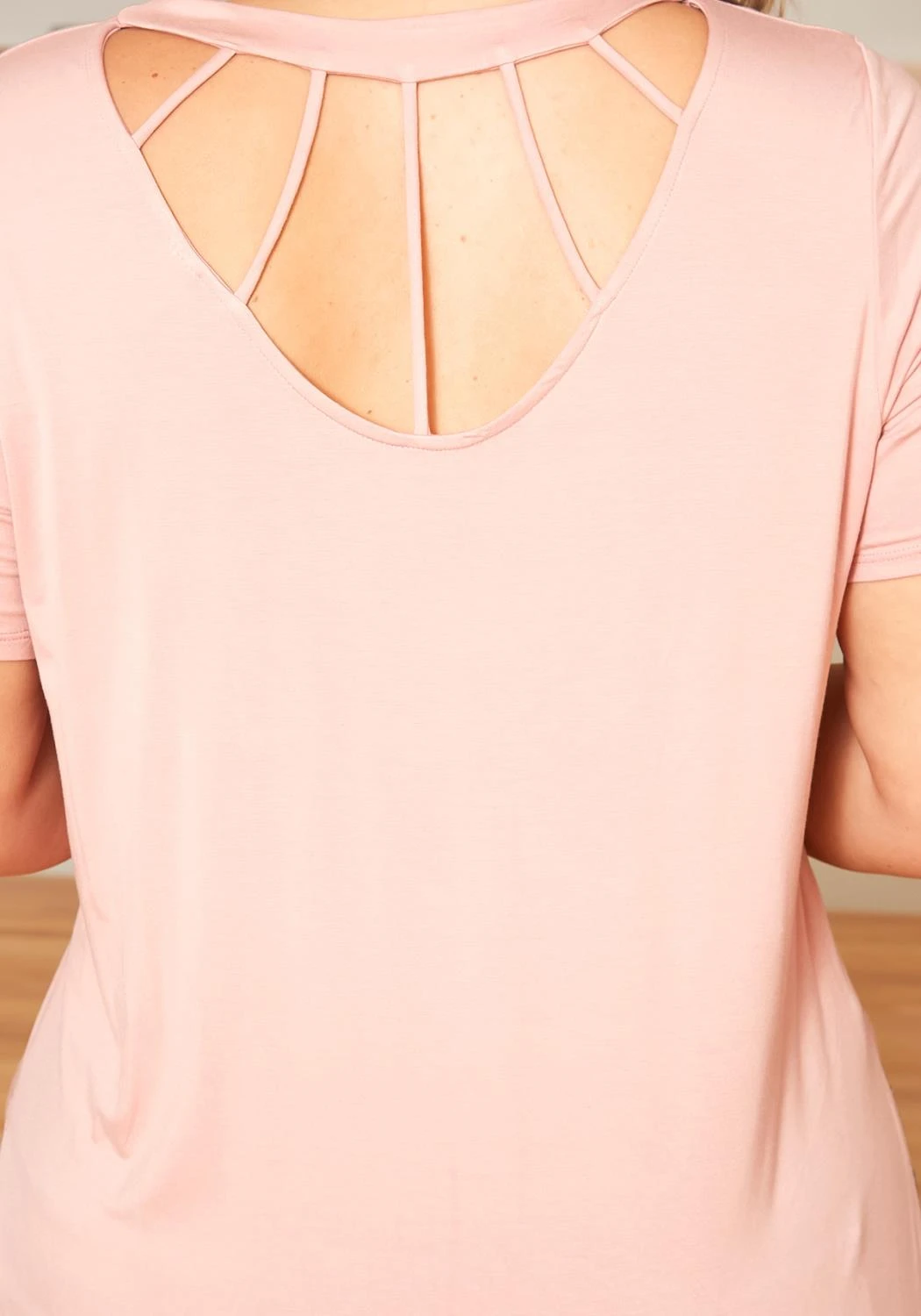 Plus size women’s essential basic t-shirt with unique windowpane back cut-out design, short sleeve, crew neck style and side slit hem.