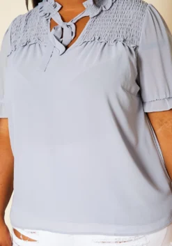 Plus size women’s top featuring shirred detail with ruffle trim ascent, v-neck hem with tie up closure, short sleeves with elastic band and ruffle cuff hem.