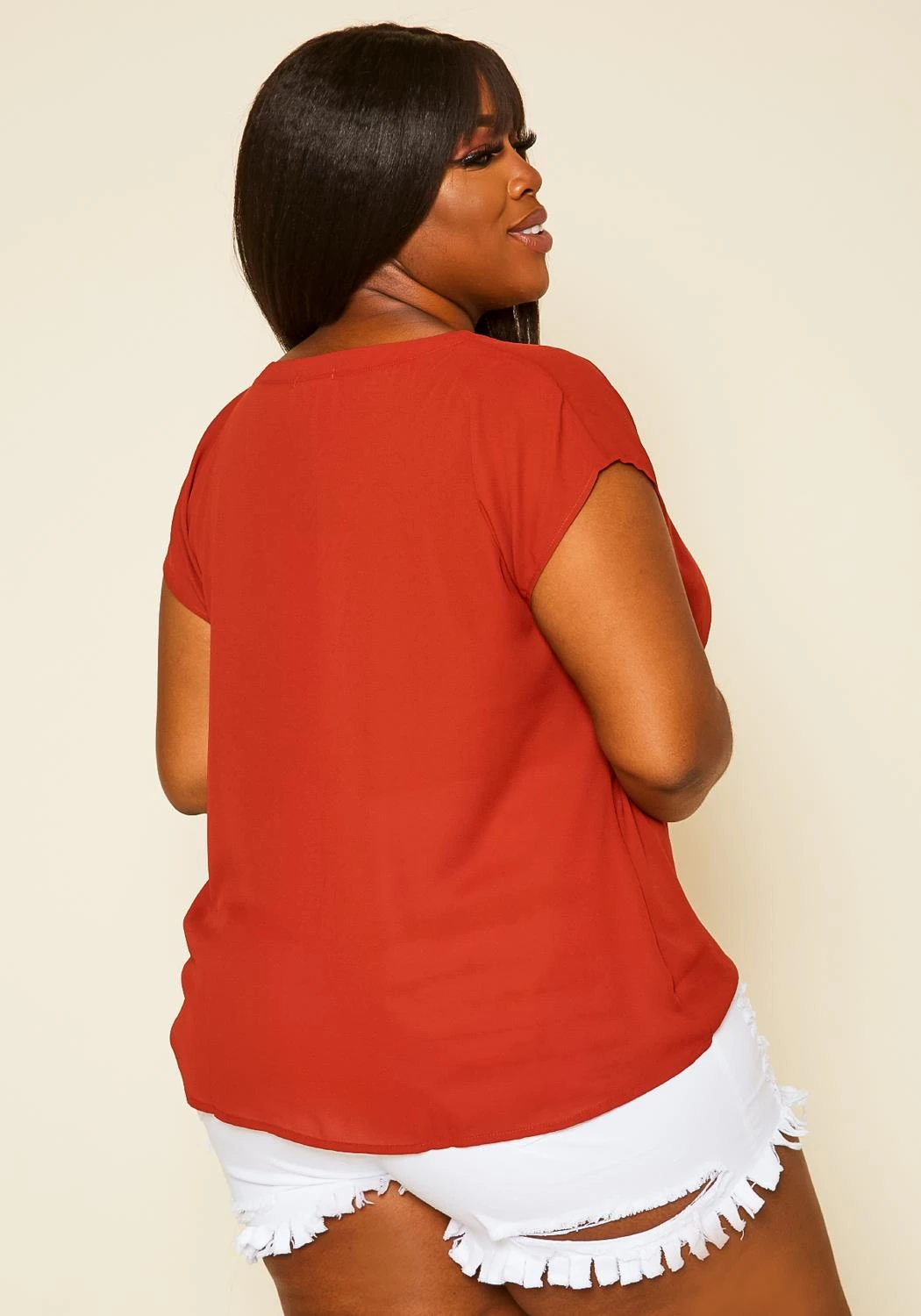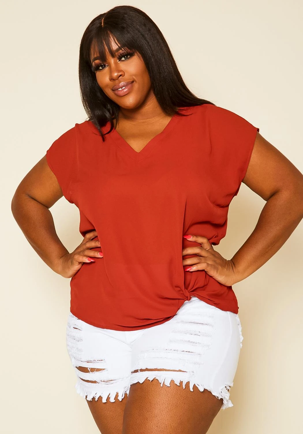 Plus size women’s top, featuring v-neck hem, front side twist detail & short sleeve hem.