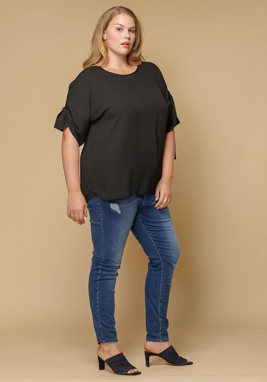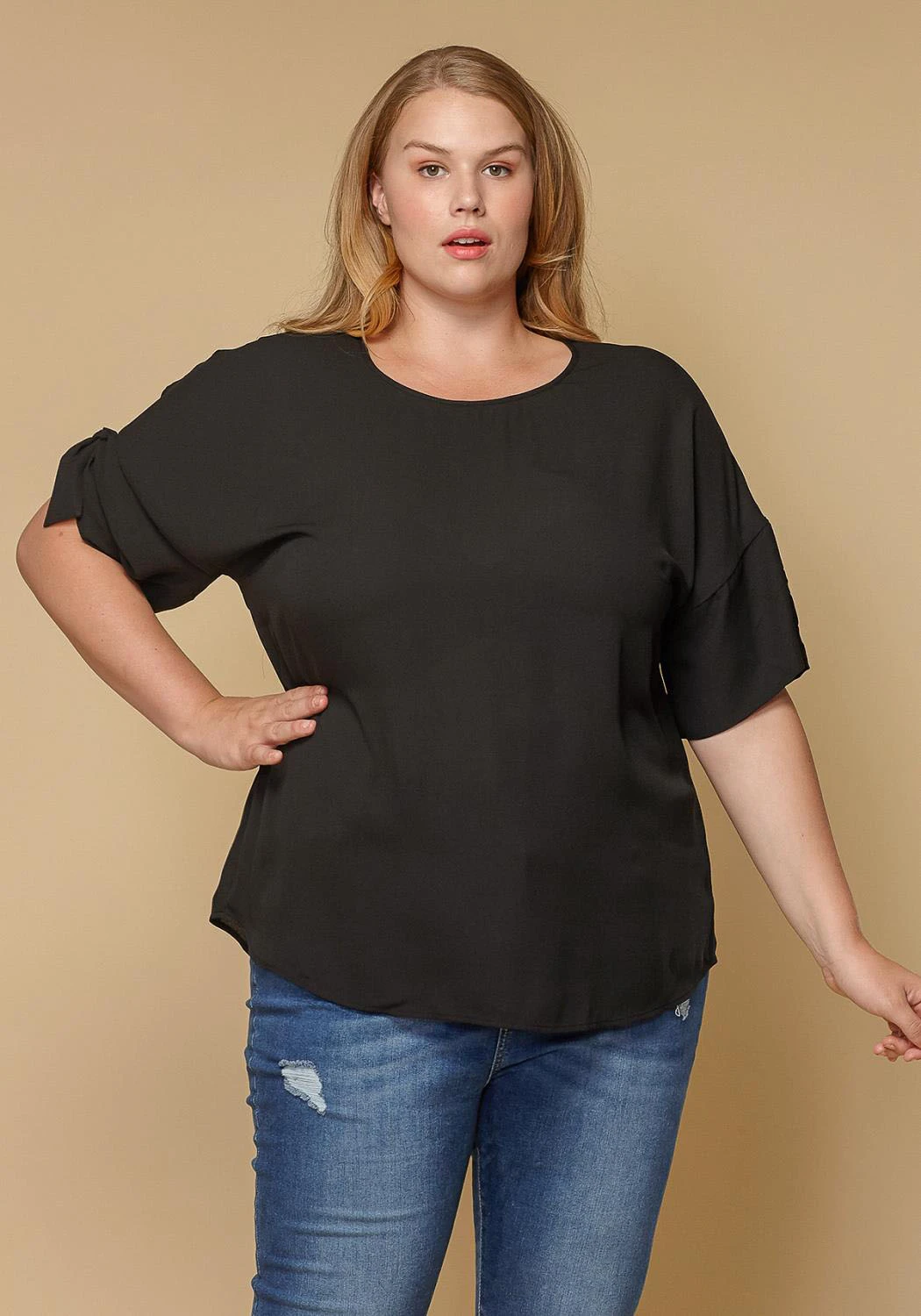Pleione Round Neck Self-tie Short Sleeve Top Plus Size Women Clothing