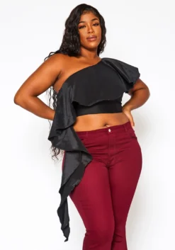 Classy plus size women’s crop top in one sleeve design and asymmetric ruffle hem design.