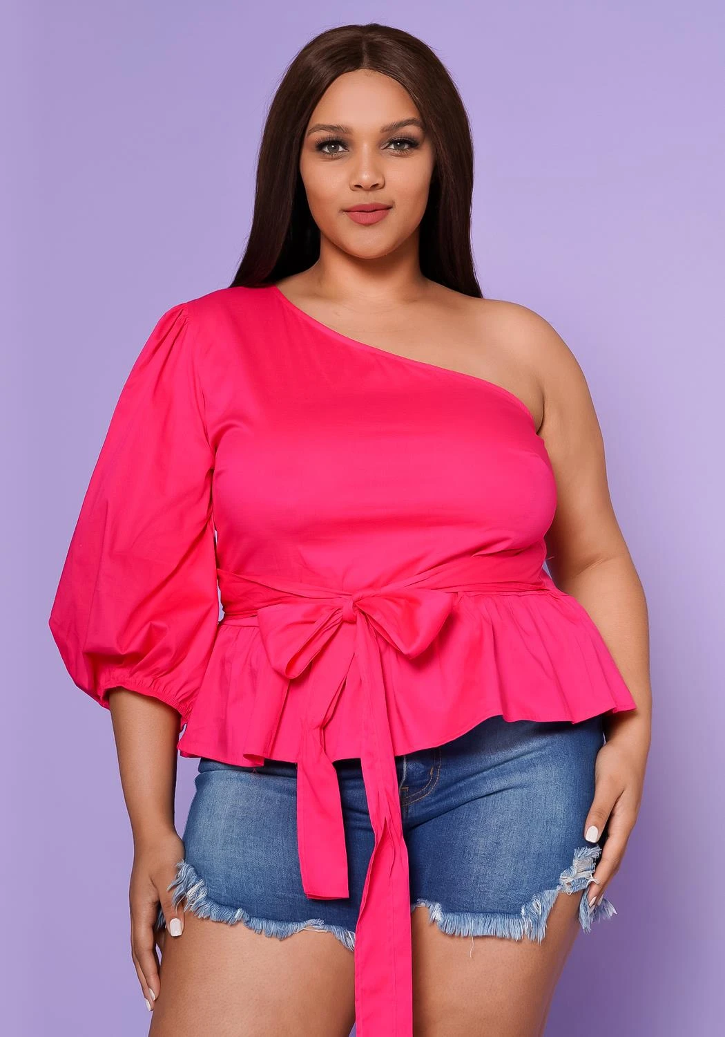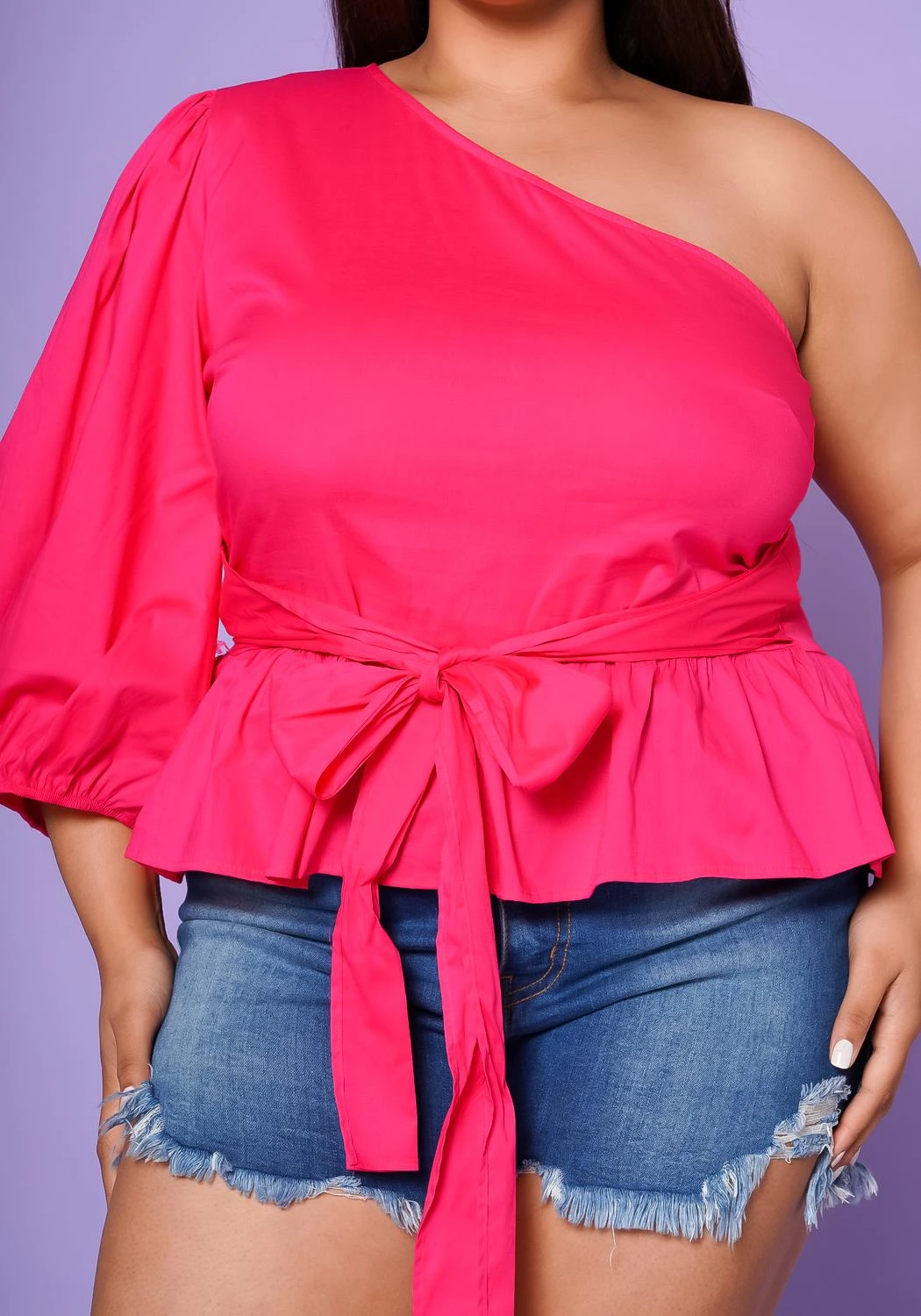 Gorgeous plus size women’s peplum blouse featuring an asymmetric neckline, one sleeve in 3/4 puffy design and waist tie ascent.