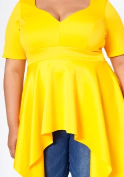 Effortless plus size women’s blouse in sweetheart v-neck style, short sleeves and asymmetric flare end.