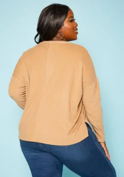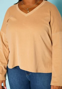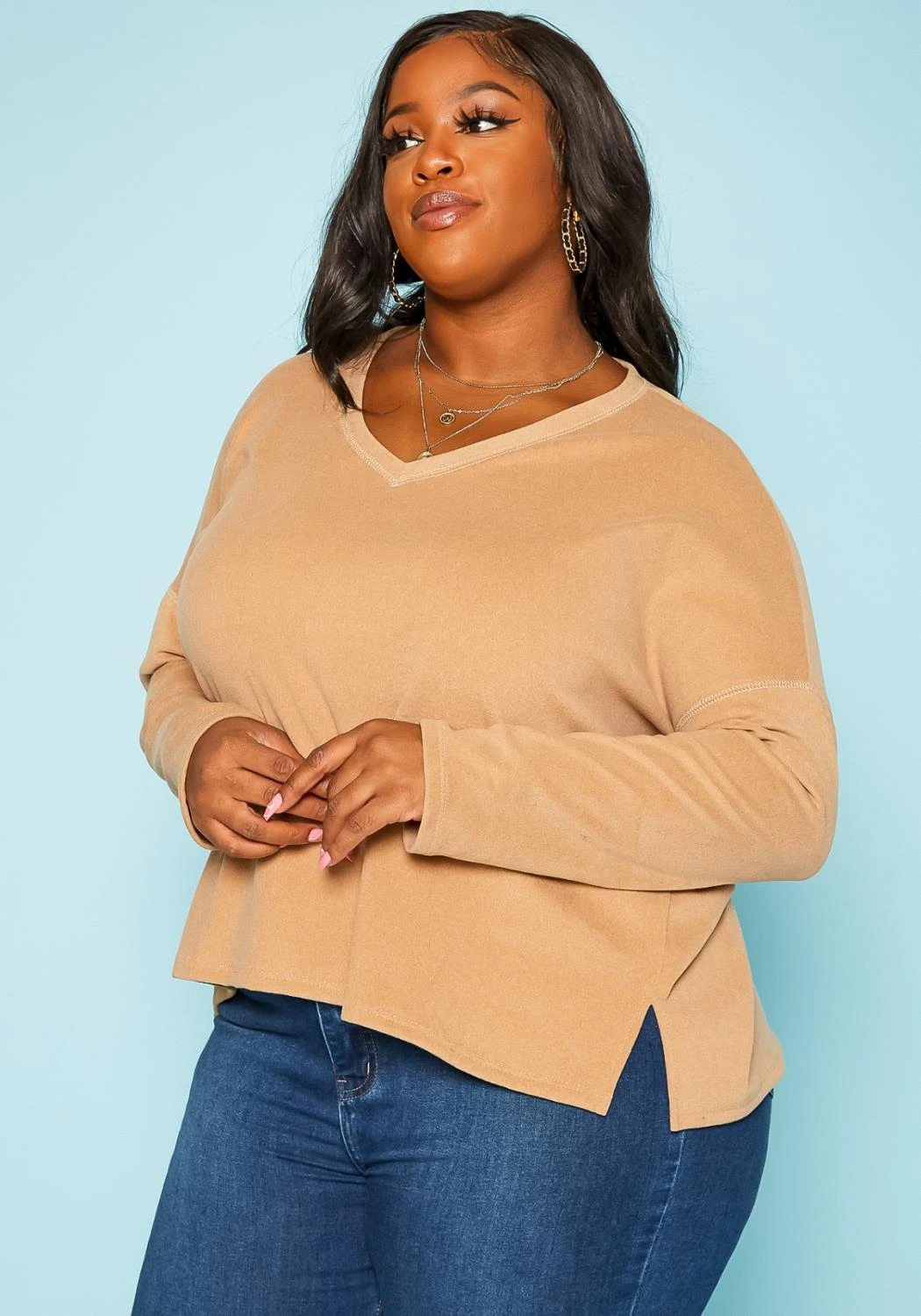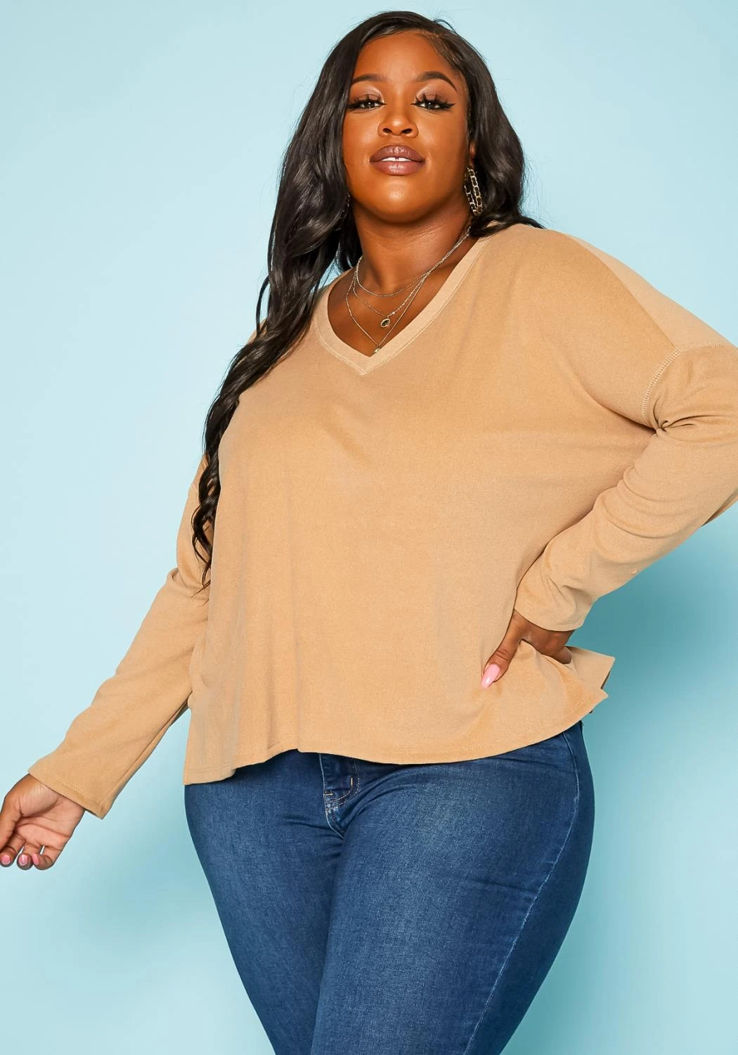 Casual plus size women’s solid color top in v-neck style, long sleeves and soft material.