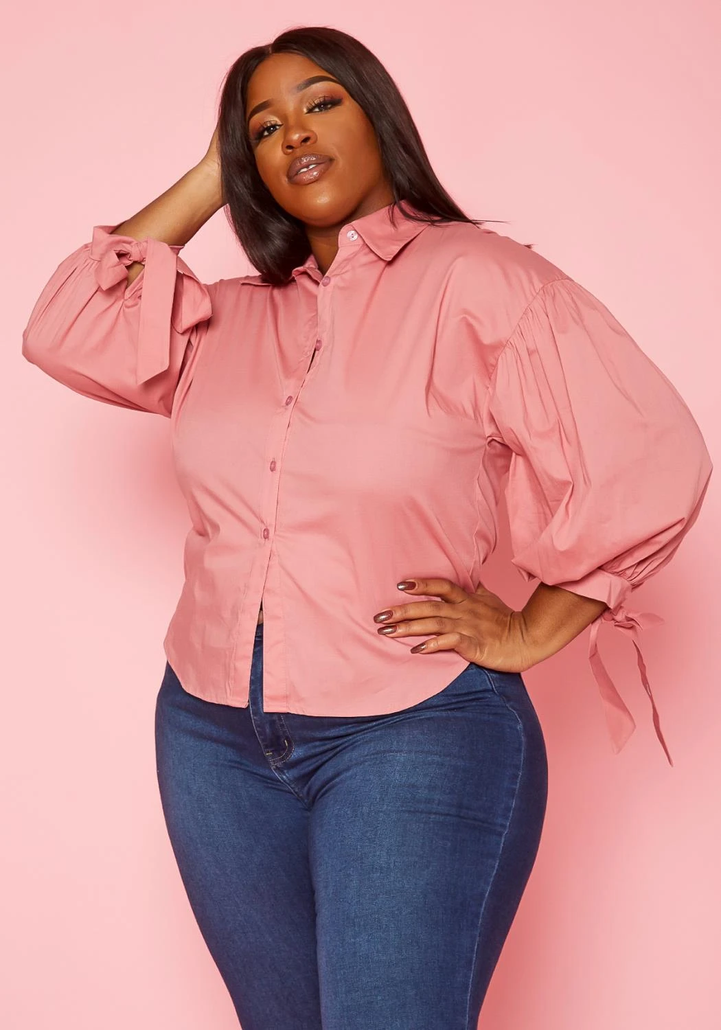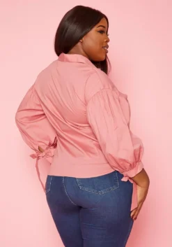 Chic plus size women’s linen shirt in collar neck style, button front closure, puffy long sleeves, wrist tie cuffs and curved hem.