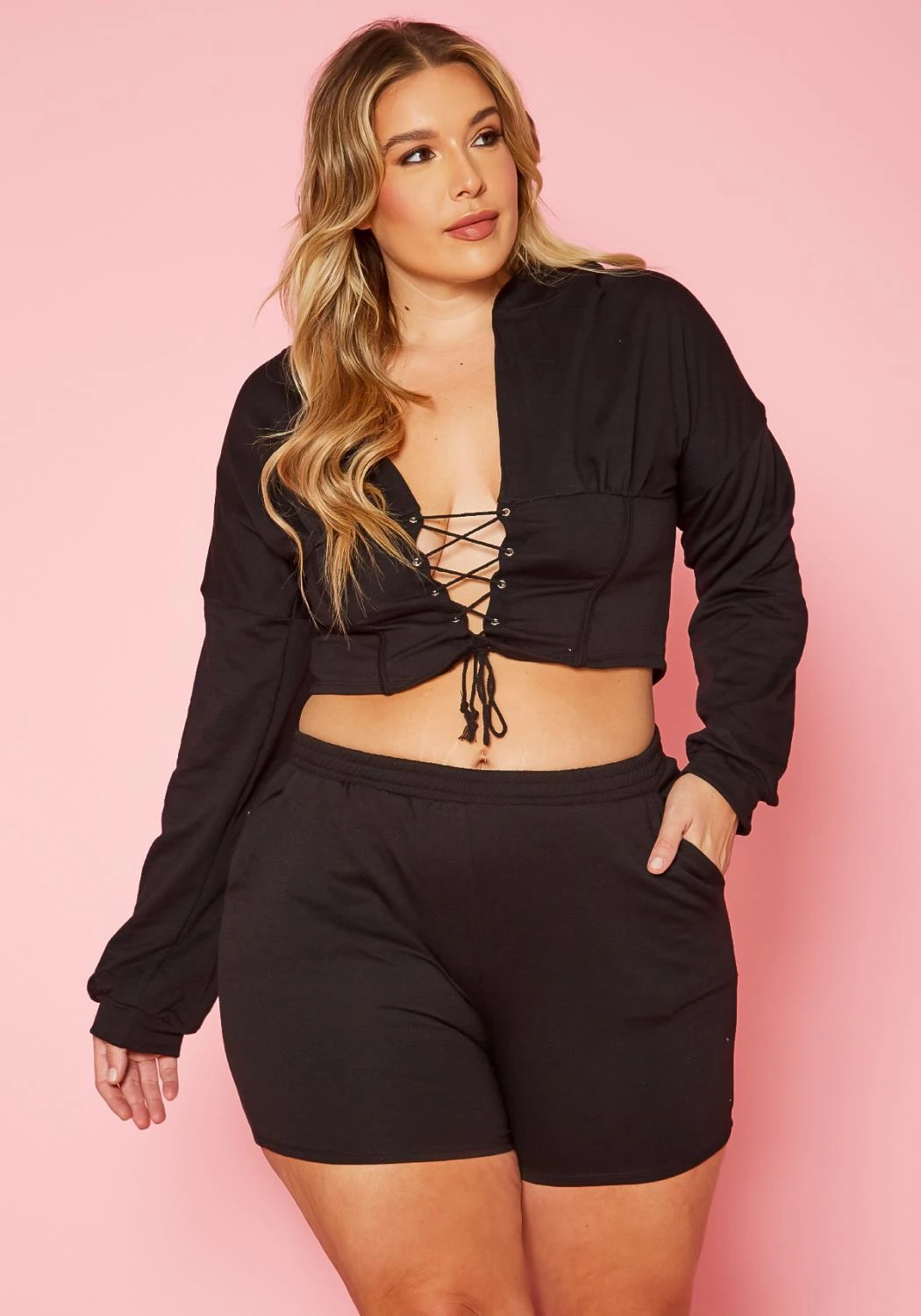Trendy lounge set for plus size women which features a hooded tie-front corset crop top and lounge shorts with pocket hem.