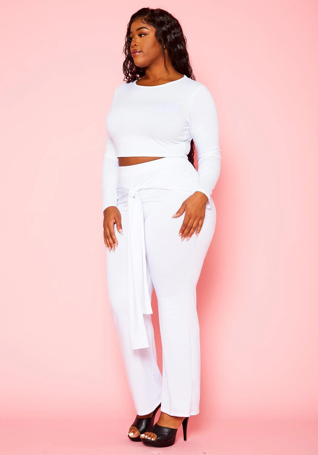 Stylish solid color matching set for plus size women which features a cropped crew neck sweater and high waist flare leg pants with belted design.