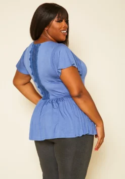 Plus size women’s top in peplum style, featuring a round neck hem, flounce short sleeves & back embroidered detail.