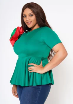 Lovely blouse made with high-quality scuba fabric. This top is designed to accentuate your figure while the flared peplum hem add a touch of elegance to your look. Not to mention, the dress has a floral decor detail for extra compliments.