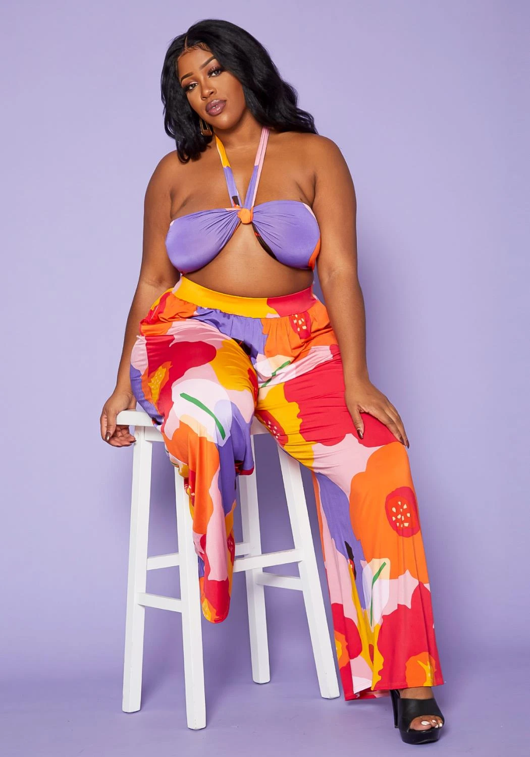 Plus size women’s set in floral print featuring a versatile wrap halter top paired with high waist palazzo pants.