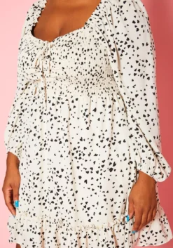Lovely fit & flare mini dress for plus size women in heart print design, long cuff hem sleeves, sweetheart neck style, shirred design with front tie up detail and back tie up closure.
