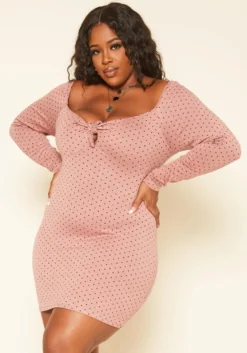 Lovely fit & flare mini dress for plus size women in heart print design, long cuff hem sleeves, sweetheart neck style, shirred design with front tie up detail and back tie up closure.