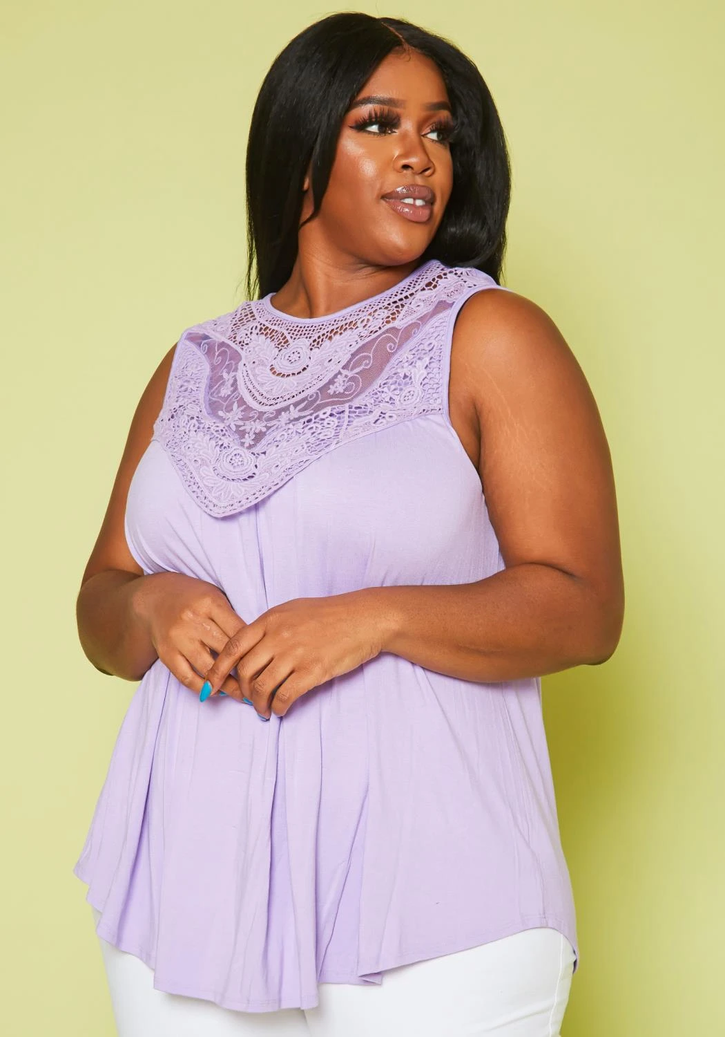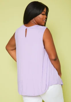 Plus size women’s casual top with lace hem design, sleeveless style, round neck style, flare hem and back neck button closure.