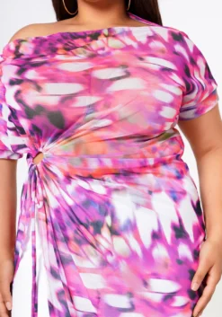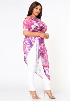 Fashion statement plus size women’s top in full mesh material, boat neckline, short sleeves, asymmetric hem and side hole and tie detail.