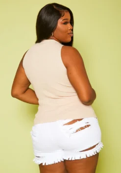 Essential ribbed knit top for plus size women, featuring a mock neck hem, sleeveless design & front cut out and middle slit style.