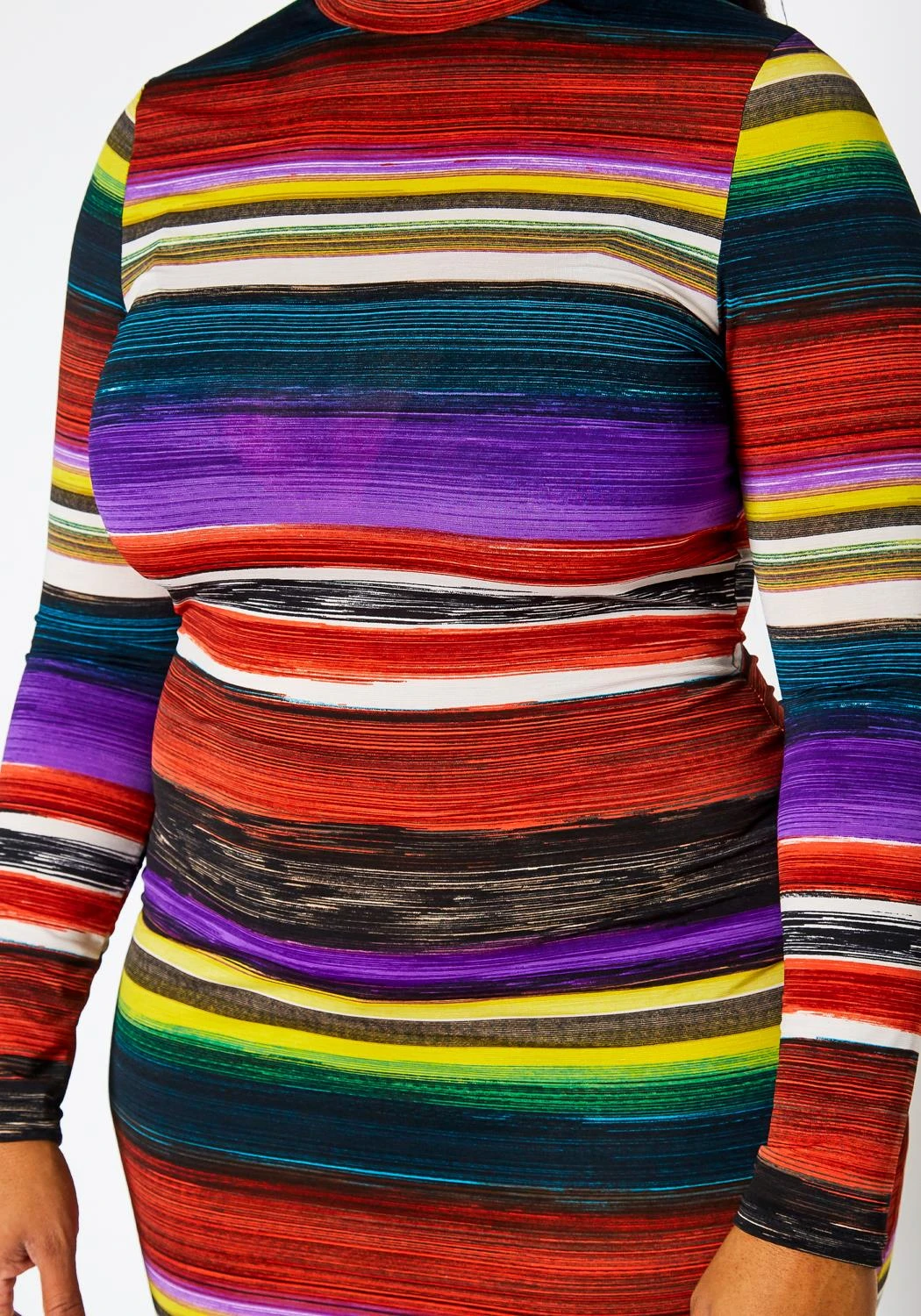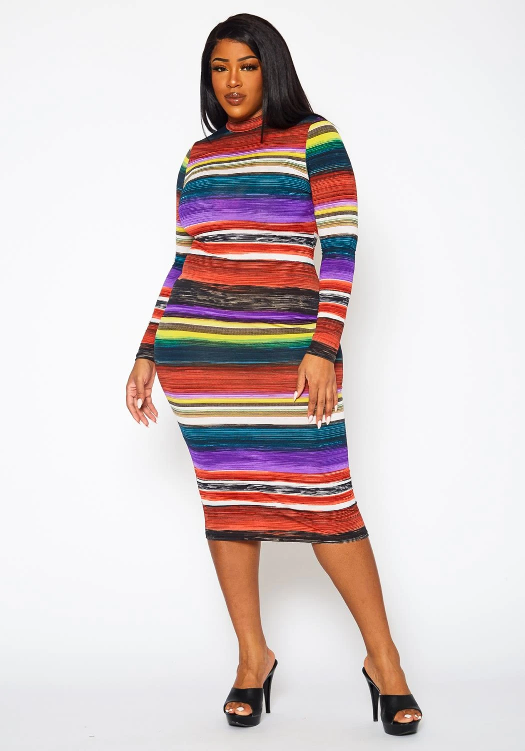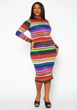 Plus Size Multi Color Pattern Long Sleeve Midi Dress