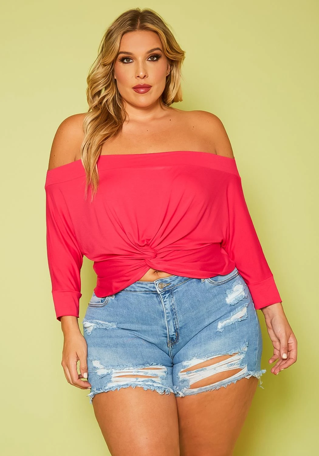 Plus size women’s top, featuring off shoulder neck hem, front twist detail & long sleeves.