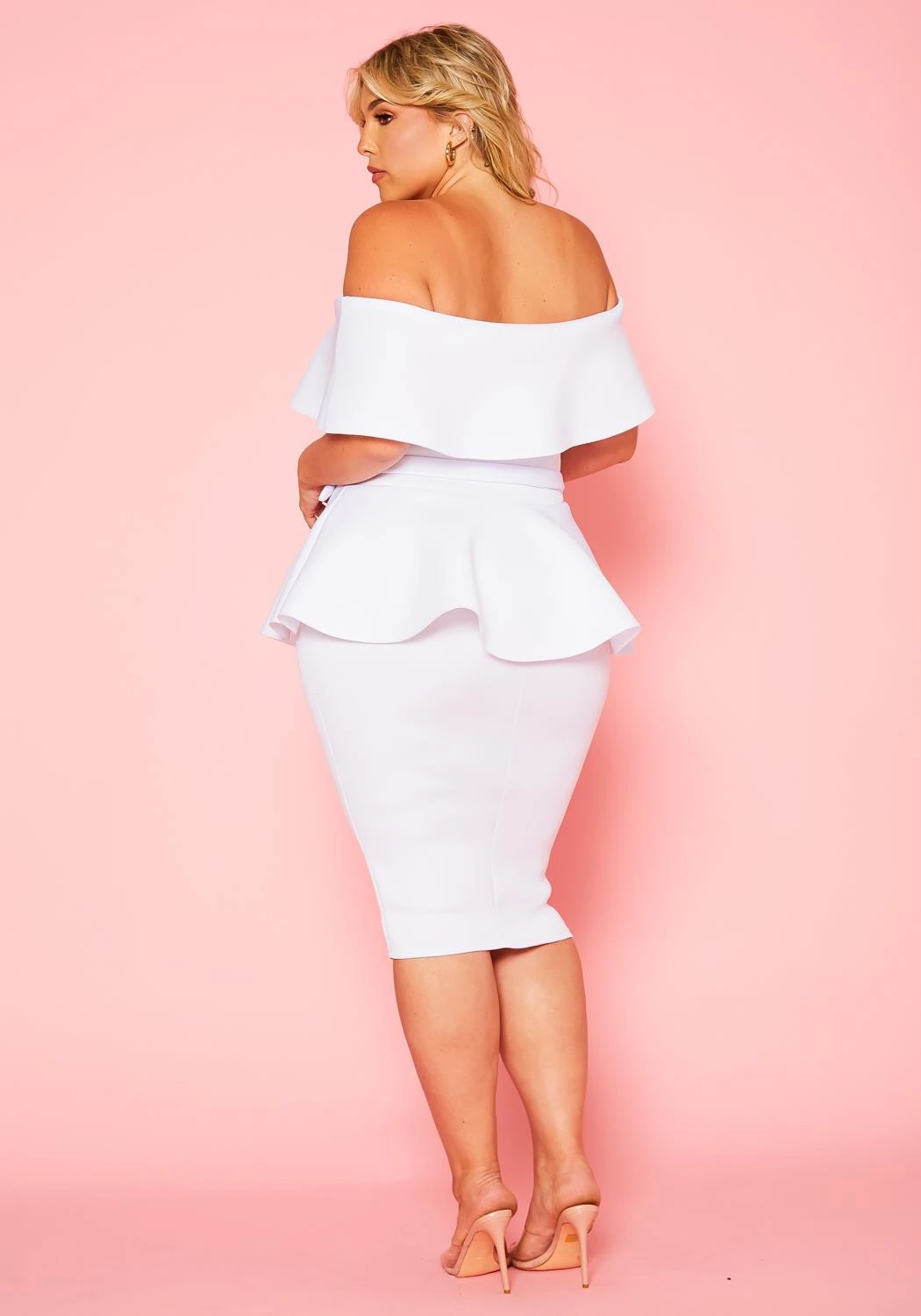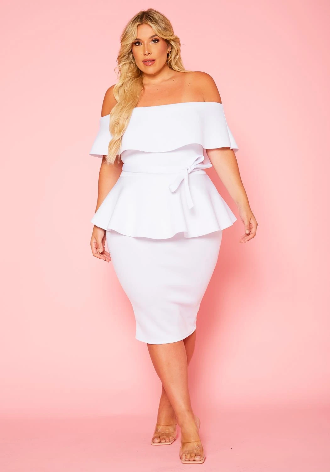 Plus size dress in peplum style, featuring a off shoulder hem, bodycon fit & a detachable waist tie up detail.