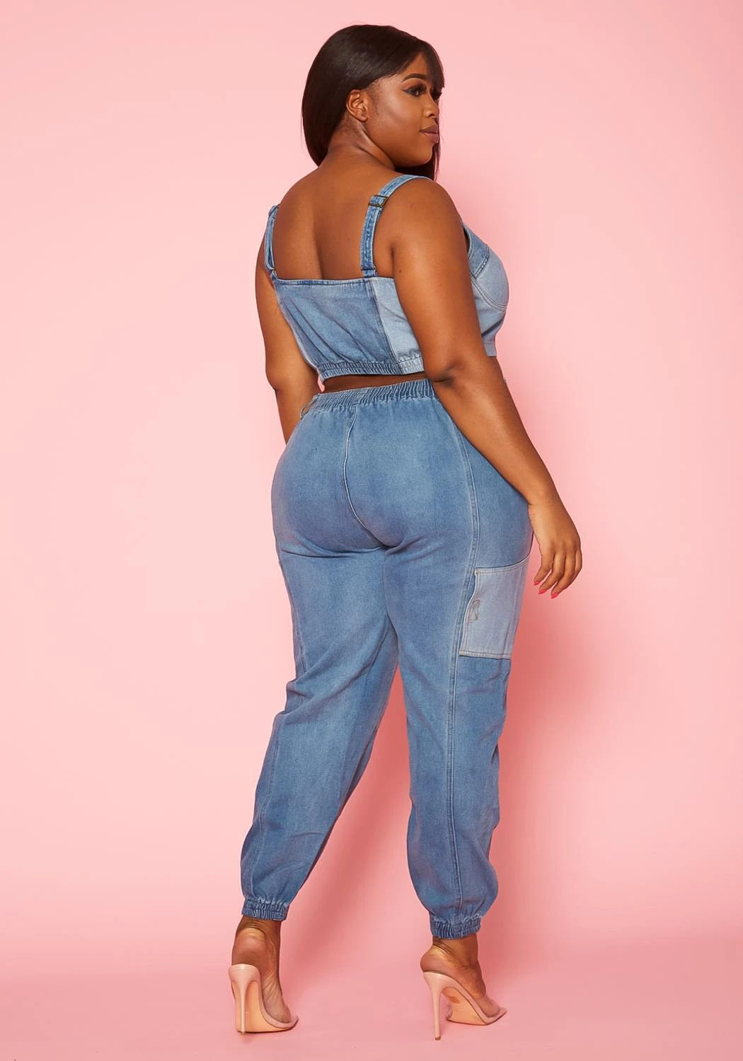 Plus size women’s set, featuring sleeveless crop top, adjustable sleeve ascent, low scoop neck, front zipper closure paired with high waist denim pants, featuring front pockets, belt loop ascent, drawstring, velcro & zipper closure.