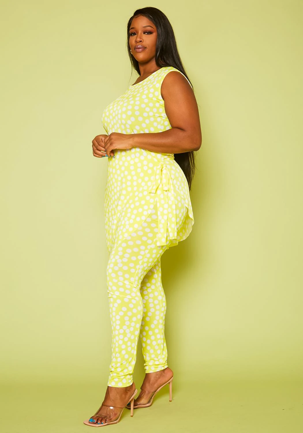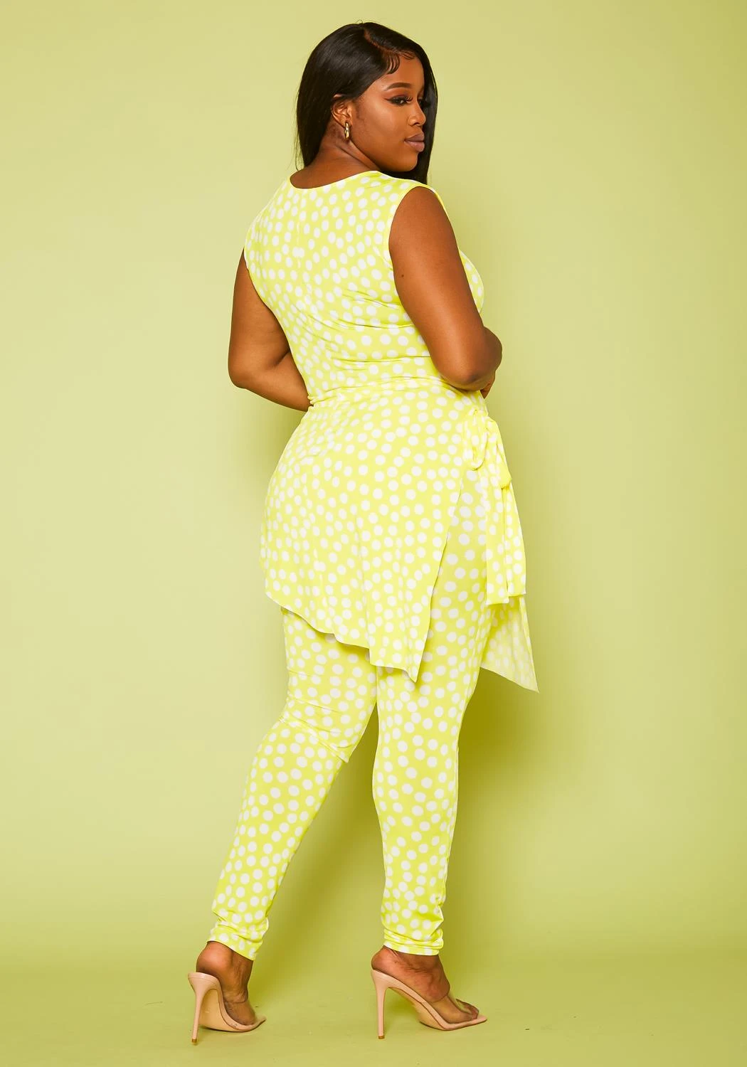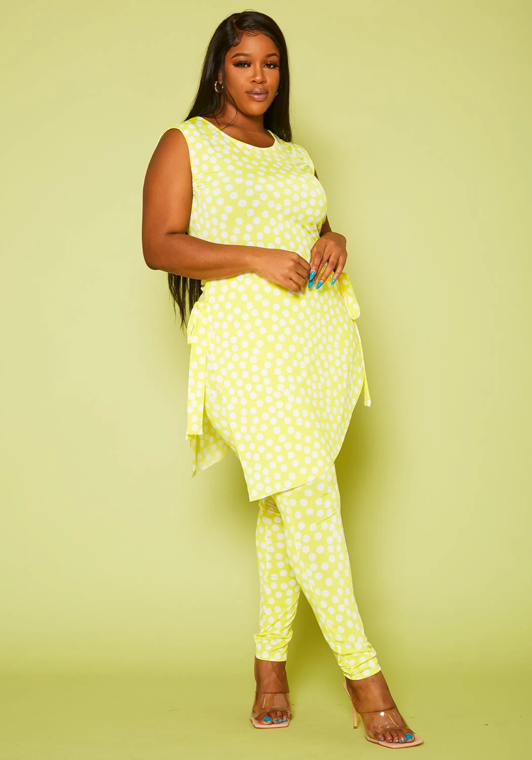Plus size women’s set, featuring a asymmetrical top, sleeveless, round neck hem with side tie up detail paired with high waist leggings.
