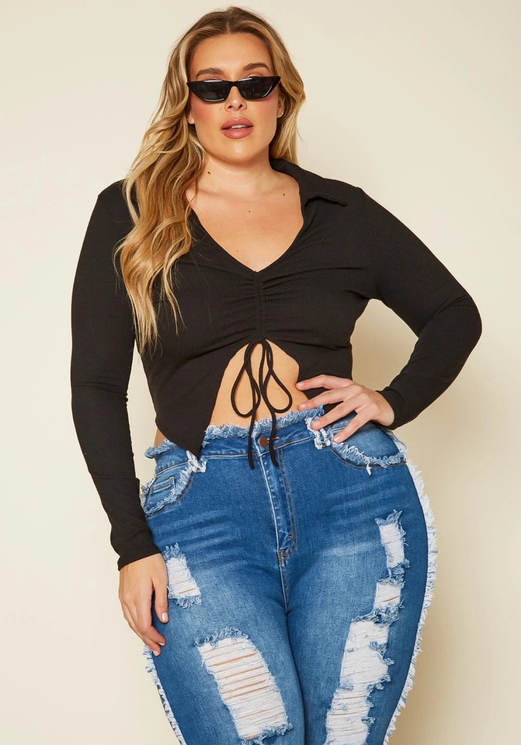 Plus size women’s top in crop style, featuring a ribbed material, collar neck hem, v-neck style, long-sleeves with drawstring and front split detail.