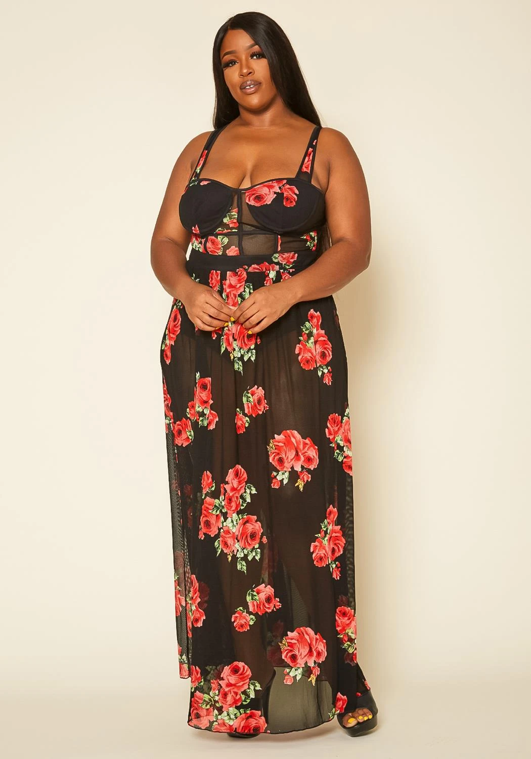 Plus size women’s dress in tank maxi style, featuring a front heart shape neckline, corset hem, sheer hem with bottom under layer underwear and back zipper closure.