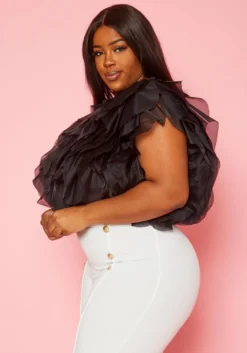 Plus size women’s ruffle tulle sleeveless, puffy crop top blouse.