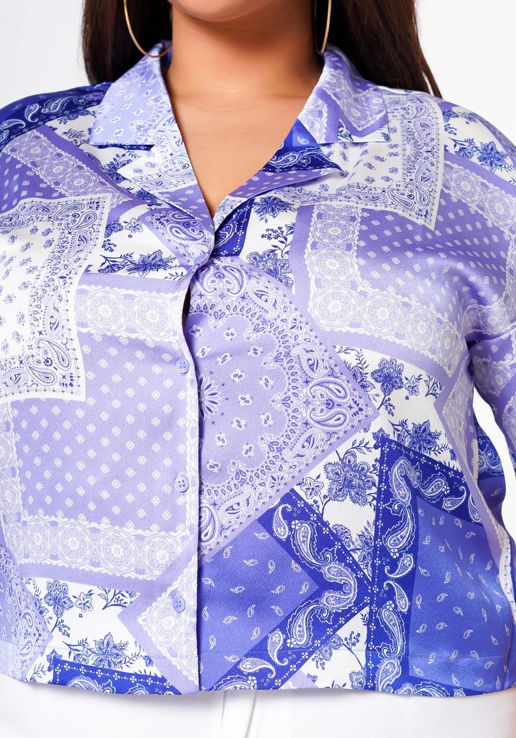 Plus Size women satin cropped shirt featured in bandana patchwork all over with short sleeves.