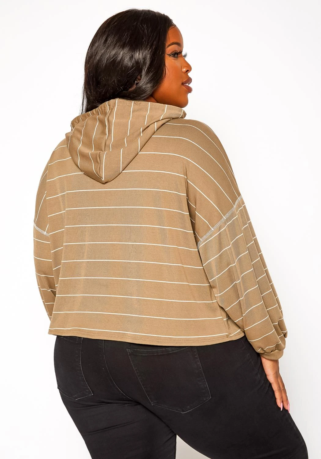Casual plus size women’s hooded sweater in striped print, relaxed fitting, hoodie drawstrings and wrist cuff hem.