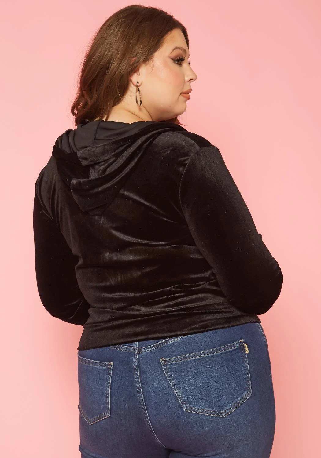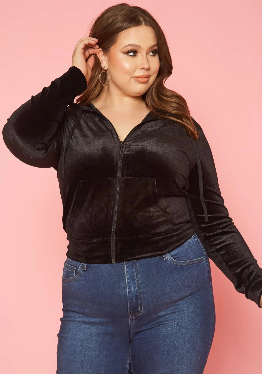 Trendy plus size women’s sweater in velvet material, hooded design, pocket hem and front zipper closure.